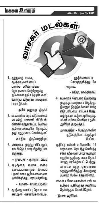 மக்கள் உரிமை பத்திரிகையில் கடந்த 16 வாரங்களாக வெளிவந்த குழந்தை மனசு கட்டுரை குறித்து வாசகர்களின் கடிதங்கள்.