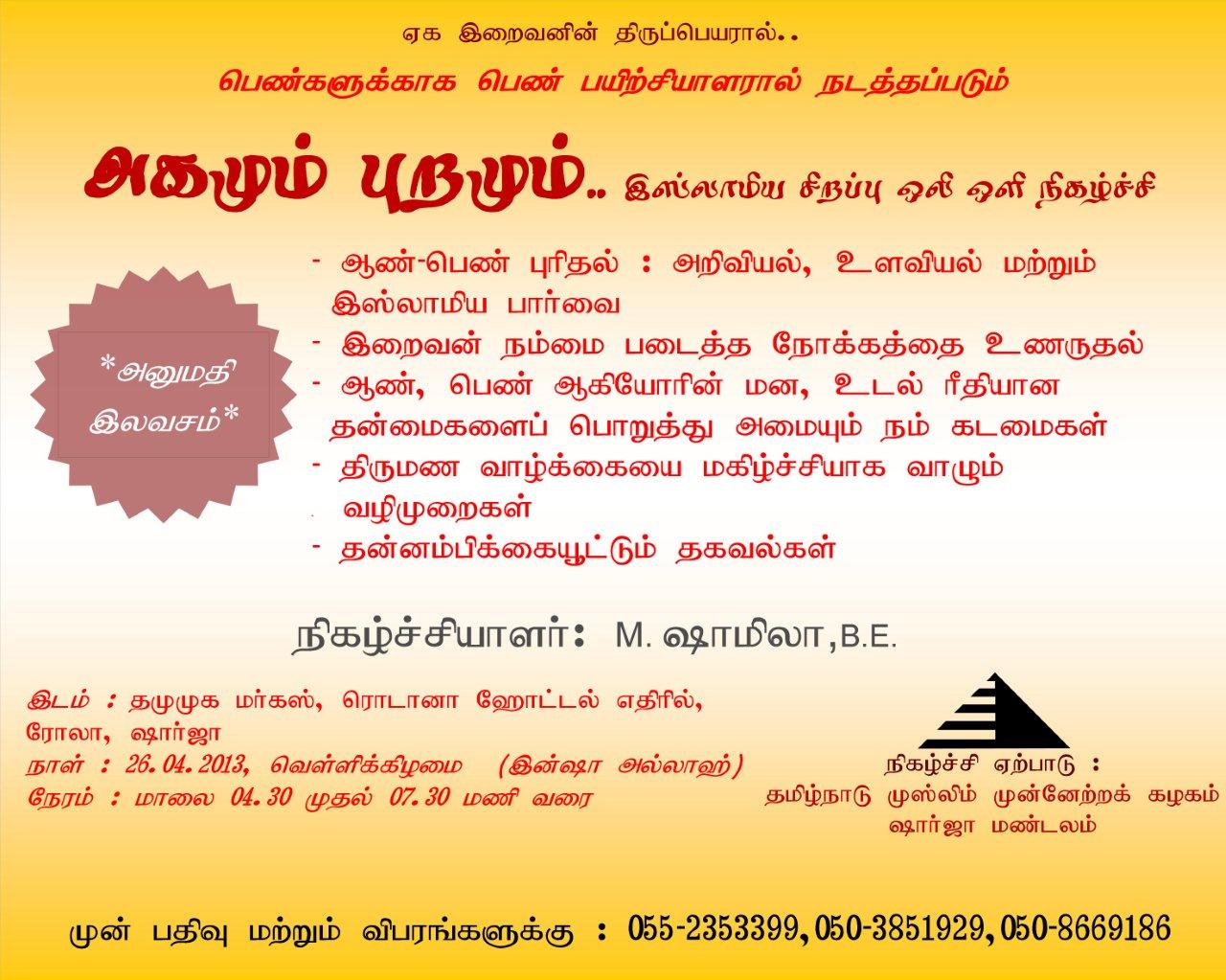ஷார்ஜா தமுமுக மர்கஸில் 26.04.2013, வெள்ளிக் கிழமை அன்று பெண்களுக்கான சிறப்பு இஸ்லாமிய நிகழ்ச்சி நடைபெற்றது. பெண் பொறியாளர் ஷாமிலா அவர்களால் நடத்தப்பட்ட இந்நிகழ்ச்சியில் பெண்கள் திரளாக கலந்துக் கொண்டு பயனடைந்தனர்.