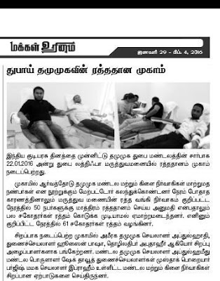 இந்திய குடியரசு தினத்தை முன்னிட்டு தமுமுக துபை மண்டலத்தின் சார்பாக இன்று22-01-2016 வெள்ளிக்கிழமை காலை 9:00 மணிமுதல் 11:30 மணிவரை துபை லத்திஃபா மருத்துவ மனையில் இரத்ததானம் முகாம் நடைப்பெற்றது.