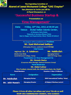 துபாய்: துபாயில் திருச்சி ஜமால் முஹம்மது கல்லூரியின் முன்னாள் மாணவர் சங்கத்தின் சார்பில் நேர மேலாண்மை குறித்தபயிற்சி முகாம் மற்றும் தொழில் முனைவோருக்கான கலந்துரையாடல் நிகழ்ச்சி அல் முத்தீனா துபாய் இந்தியன் இஸ்லாமிக்சென்டர் வளாகத்தில் 16.12.2011 வெள்ளிக்கிழமை மாலை நடைபெற்றது.