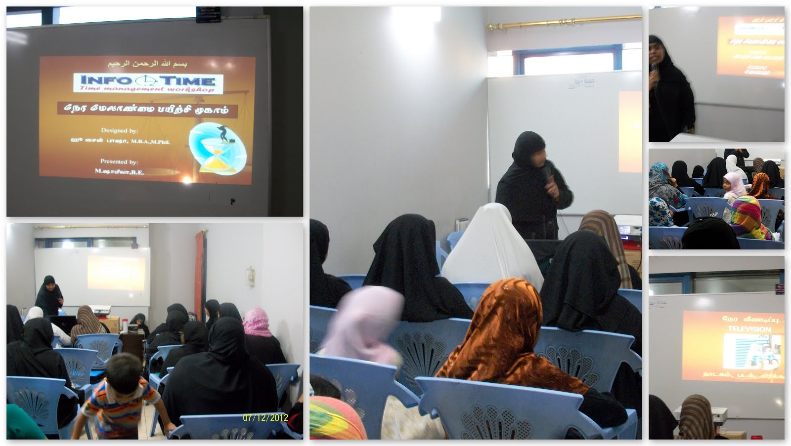 நேர மேலாண்மை குறித்த இஸ்லாமிய பார்வை, இலக்குகளைத் தீர்மானித்தல், முன்னுரிமை கொடுக்க வேண்டிய செயல்கள், திட்டமிடுதலின் அவசியம், வேலைகளைத் தள்ளிப் போடாமல் உடனே செய்வதனால் ஏற்படும் பலன்கள், செய்முறை பயிற்சி ஆகியவற்றைக் குறித்து பெண் பொறியாளர் ஷாமிலா அவர்கள் பயிற்சியளித்தார்.