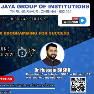 Webinar on Mind Programming for Success organised by Jaya Group of Institutions, Thiruninravur, Chennai on 30.06.2020. Key address delivered by Prof. M. Kumaran. Guest Lecture