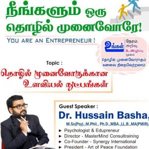 சவுதி அரேபியாவின் tab G குழுமம் 04.07.2020 அன்று நடத்திய நிகழ்ச்சியில் முனைவர் ஹுஸைன் பாஷா அவர்கள் கலந்துகொண்டு தொழில் முனைவோருக்கான உளவியல் நுட்பங்கள் என்ற தலைப்பில் சிறப்புரையாற்றினார். tab G குழுமத்தின் தலைமை