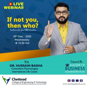 Webinar on “If not you, then who?” organised by Chettinad College of Engineering & Technology, Karur on 09.12.2020 for 1st year MBA Students. Guest Lecture
